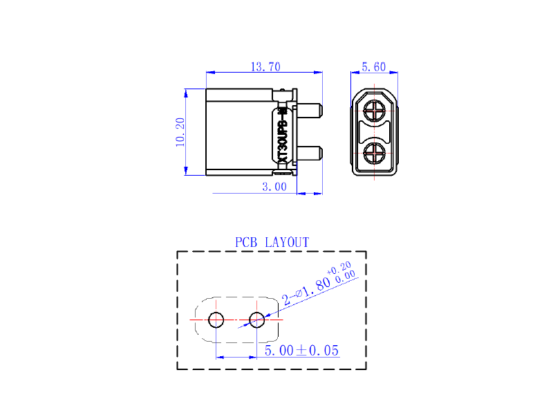 Разъем силовой XT30, 2 контакта, штекер на плату