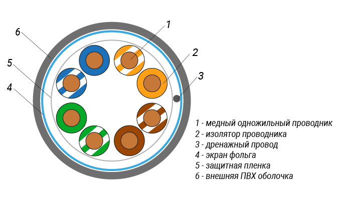 Четырехпарный (восьмипроводный) одножильный (SOLID) кабель витая пара FTP, категории 5e, применяется для передачи данных со скоростью до 1 Гбит/c. Сечение каждого из 8 проводов - 24 AWG. Этот кабель используется, как правило, для коротких участков и предназначен для прокладки внутри помещений в структурированных кабельных системах. Экранированная витая пара широко применяется в локальных сетях, в том числе на производствах, где на передачу сигнала возможно влияние электромагнитного излучения.