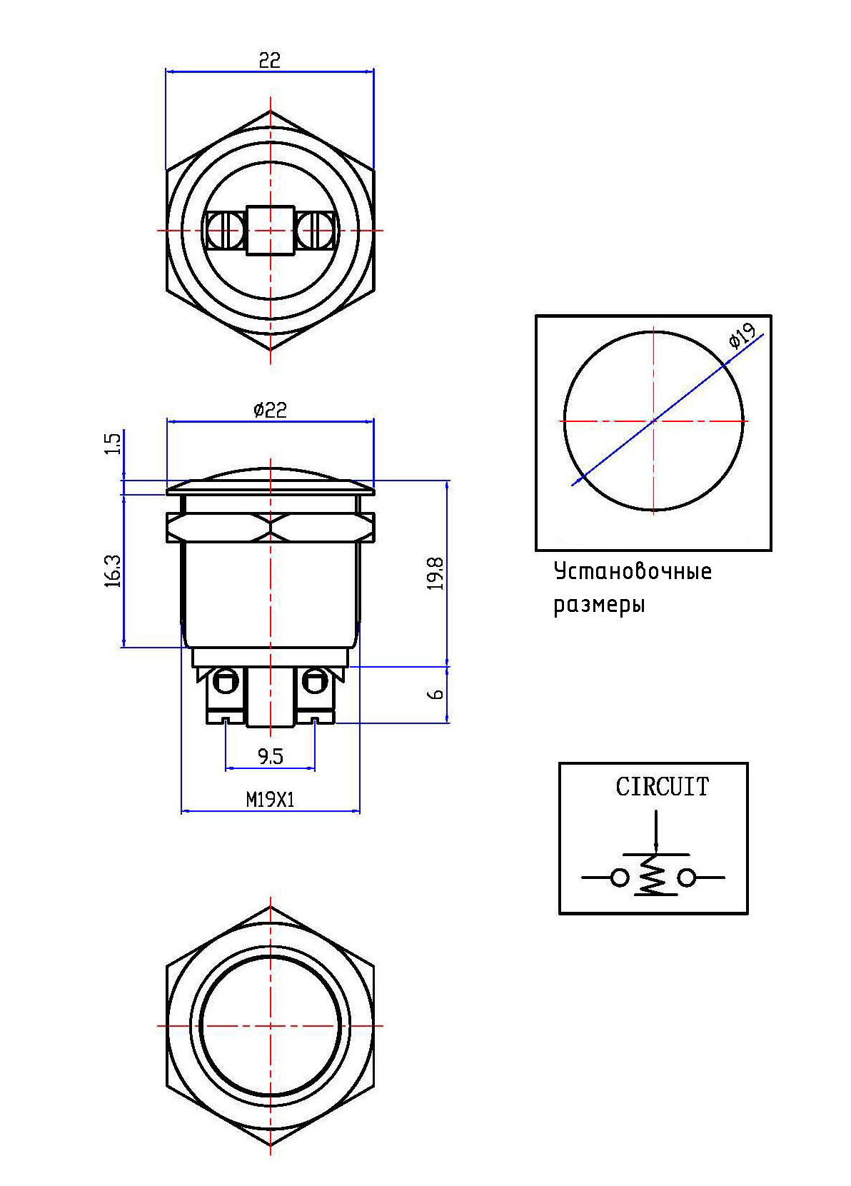 PSW-14 Кнопка круглая 220В 2А, крепление гайка