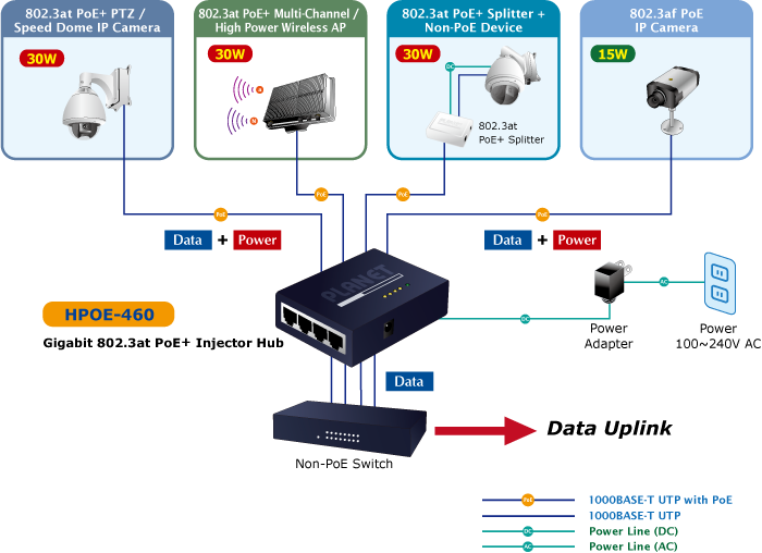 Имея 4 порта Gigabit Ethernet 10/100/1000Base-T, HPOE-460 поддерживает питание 52 В постоянного тока для любого удаленного устройства (PD) с питанием 802.3af / 802.3at, не влияя на производительность передачи данных. HPOE-460 поддерживает бюджет мощности PoE в 120 Вт, что обеспечивает питание 4 устройств 15,4 / 30,8 Вт PoE. Это экономичное и быстрое решение для модернизации сетевой системы до стандарта IEEE 802.3af / IEEE 802.3at Power over Ethernet без замены существующего коммутатора Ethernet. На передней панели HPOE-460 расположены 8 портов RJ-45 STP, из которых 4 порта в правом направлении работают как "вход данных", а другая половина в левом направлении - как "выход PoE (данные и питание)". 4 порта "PoE (данные и питание) выход" также являются инжекторами питания, которые передают постоянное напряжение на кабель CAT. 5/5e/6 и передают данные и питание одновременно между инжекторами и сплиттерами.