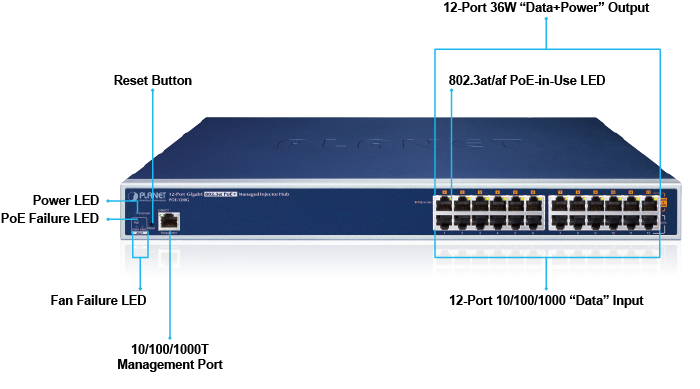 POE-1200G Управляемый PoE инжектор Planet 12 портов 10/100/1000 Мб/с, IEEE 802.at, 200Ватт